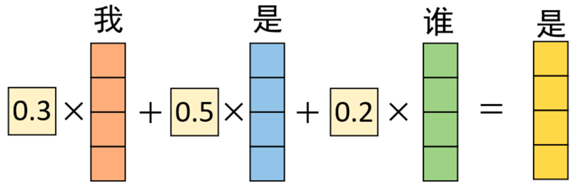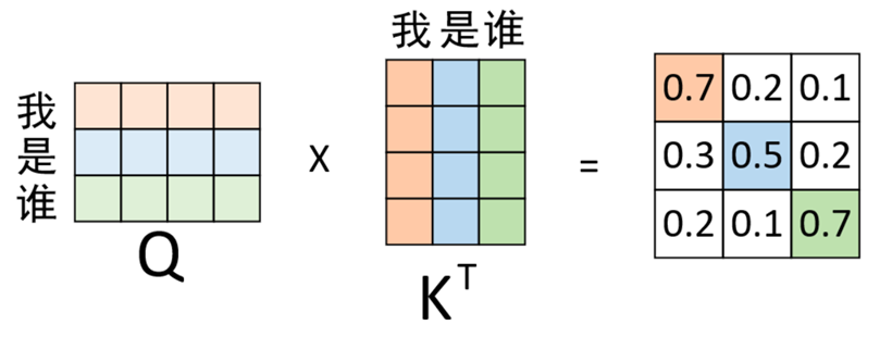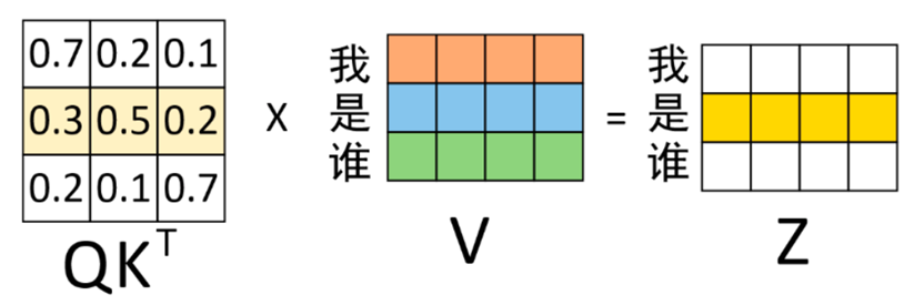 第1行中,0.7表示“我”与“我”的注意力值;0.2 表示“我”与“是”的注意力值;0.1表示“我”与“谁”的注意力值。在对序列中的“我”进行编码时,应将0.7的注意力放在“我”上,0.2注意力放在“是”上,将0.1注意力放在谁上。