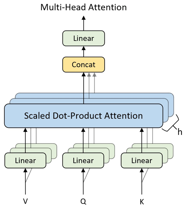 在论文中,作者使用了h=8个并行的自注意力模块来构建一个注意力层,对于每个自注意力模块限定了。这里可以发现,多头注意力机制是将一个大的高维单头拆分成了h个多头。因此,整个多头注意力机制计算过程可以通过如图所示来进行表示。