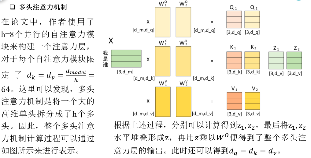 模型在对当前位置的信息进行编码时,会过度的将注意力集中于自身的位置,因此作者提出了通过多头注意力机制来解决这一问题。同时,使用多头注意力机制还能够给予注意力层的输出包含有不同子空间中的编码表示信息,从而增强模型的表达能力。