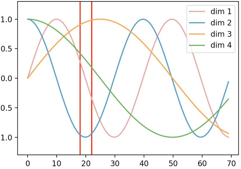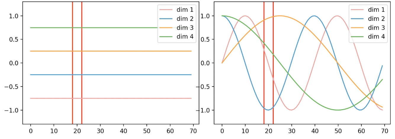 如图所示,横坐标表示输入序列中的每个Token,每条曲线或直线表示对应Token在该维度上对应的位置信息。图中每个维度所对应的位置信息都是一个不变的常数;而右图中,每个维度所对应的位置信息均为基于某个公式变换得到的。换句话说就是,左图中任意两个 Token 上的向量都可以 进行位置交换而模型却不能捕捉到这一差异,但是加入右图这样的位置信息模型却能够感知到。