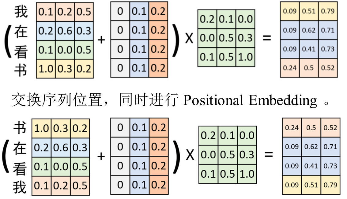 在交换序列位置后,采用同样的Positional Embedding进行处 理,并进行线性变换。可以发现,其结果同之前的计算结果本质上没有发生变换。因此,这再次证明,如果Positional Embedding中位置信息是 以常数形式进行变换,那么这样的 Positional Embedding是无效的。