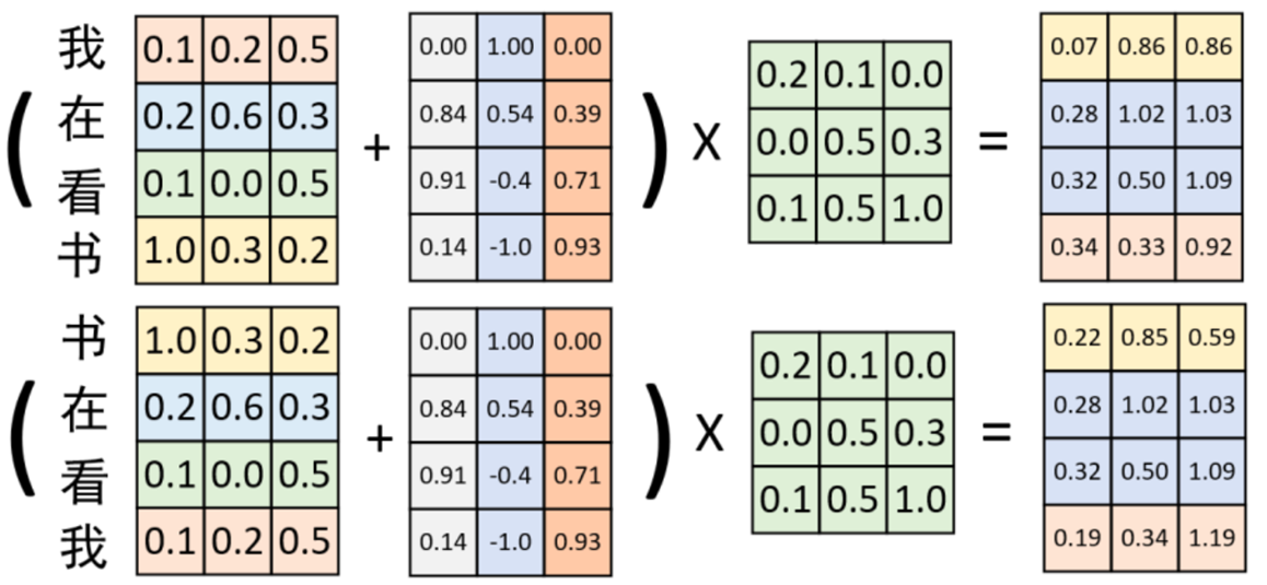 因为自注意力机制在实际运算过程中只是若干个矩阵进行线性变换。 因此即使打乱各个词的顺序,那么最终计算得到的结果本质上却没有发生任何变换,只是交换了对应的位置,但在实际情况中交换位置表达的含义也就不同。如图所示: