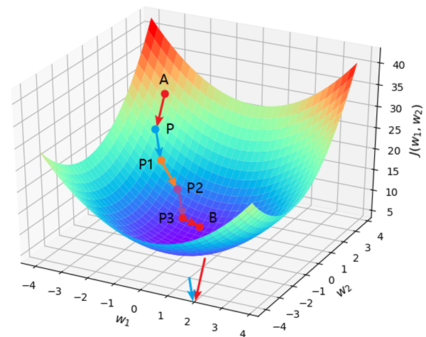 现在有一个模型的目标函数J(w1,w2)=w12+w22+2w2+5,其中w1和w2为待求解的权重参数,并且随机初始化点A为初始权重值。