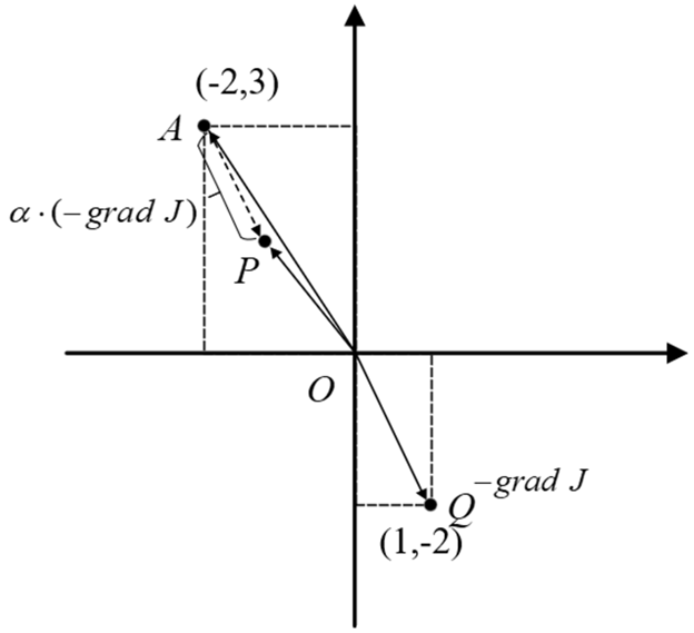OQ为平面上梯度的反方向,AP为其平移后的方向,但是长度为之前的α倍,因此,根据梯度下降的原则,此时曲面上的A点就该沿着其梯度的反方向跳跃,而投影到平面则为A应该沿着AP的方向移动。假定曲面上从A点跳跃到了P点,那么对应在投影平面上就是图中的AP部分,同时权重参数也从A的位置更新到了P点的位置。