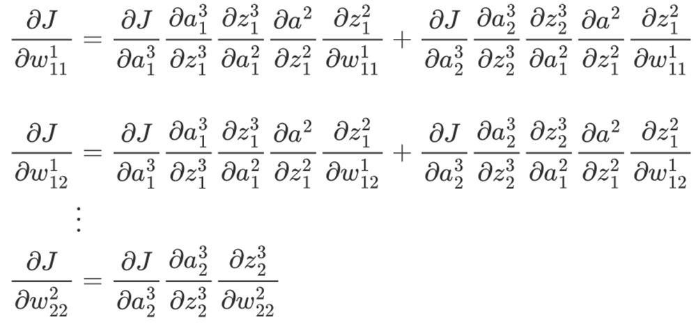 也就是说,这个权重影响隐藏层的第一个神经元输出 a12, 而 a12 又会影响输出层的两个节点 a13,a23, 它们最终共同影响损失 J。