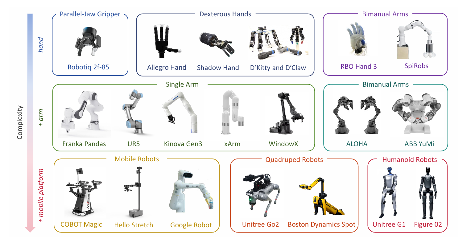 机器人操作所依赖的硬件平台决定了机器人的任务执行能力,不同的硬件系统适用于不同的操作任务。常见的机器人平台包括: